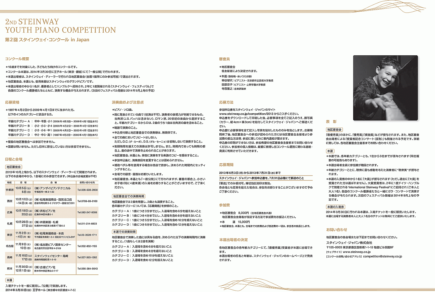 ・ 本選出場者の中から1名が、優勝者としてハンブルクへ招待され、二年に一度開催される「スタインウェイ・フェスティバル」で各国のコンクール優勝者たちとともに、演奏する機会が与えられます。(次回のフェスティバル開催は2014年9月5日~8日の予定)