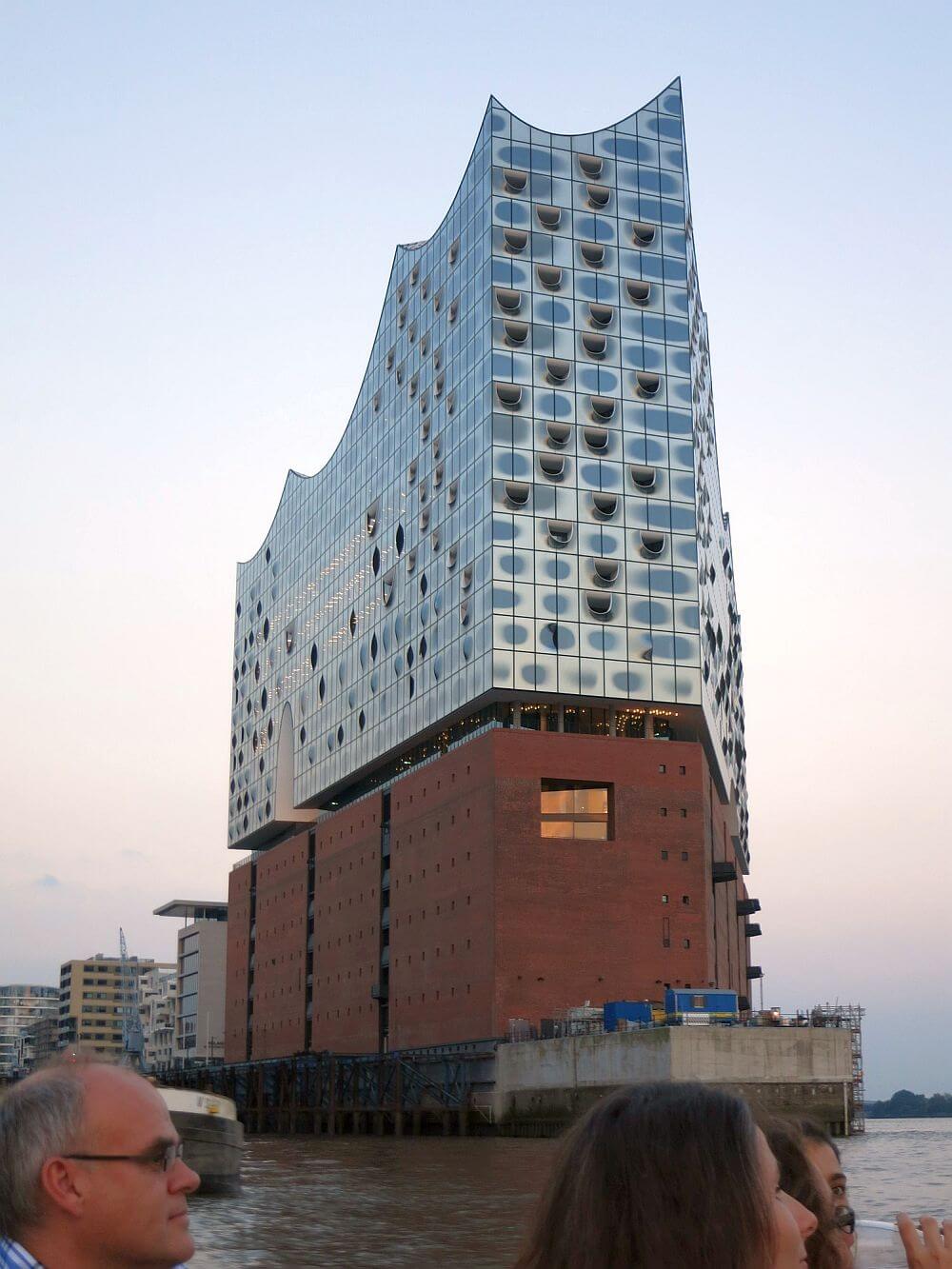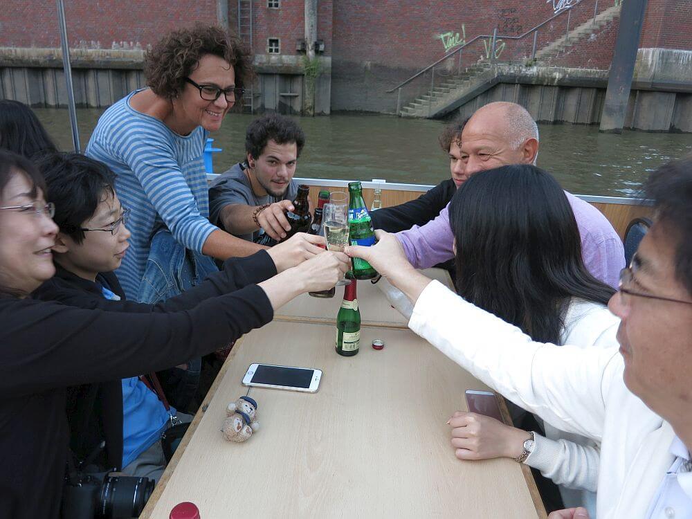 夜: 多国籍の参加者全員でハンブルクの港へ。船上での夕食会。2017年1月にオープンする新築のエルプ・フィルハーモニーの建物も間近で見えました。