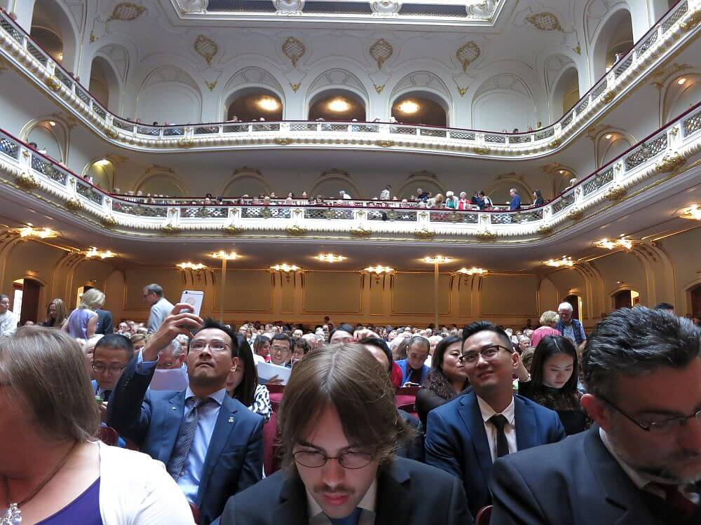 市内中心地ブラームス広場にある“Laeiszhalle”。2000人収容の大ホールは毎回満席となります。