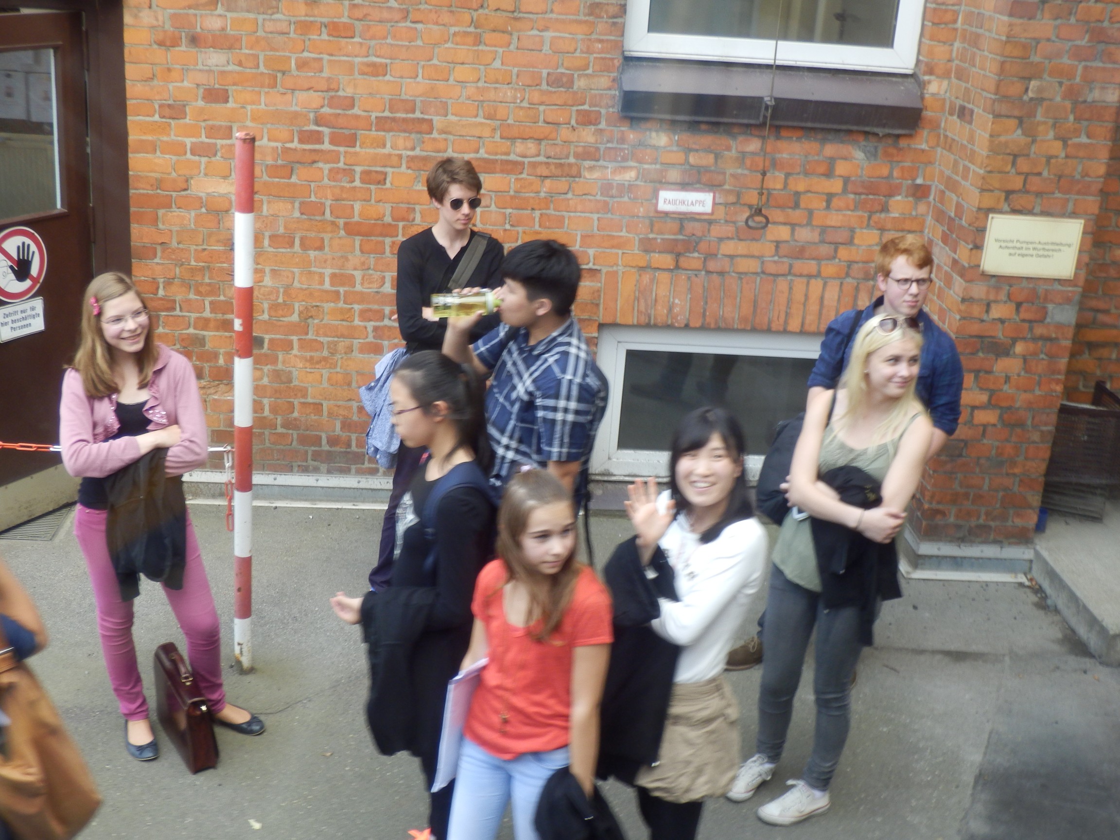 午後: 演奏者8人がスタインウェイ工場内で前日練習に。親はバスの中からお見送り